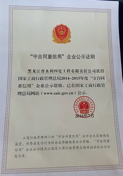2014-2015年度國家級(jí)“守合同重信用企業(yè)”證書